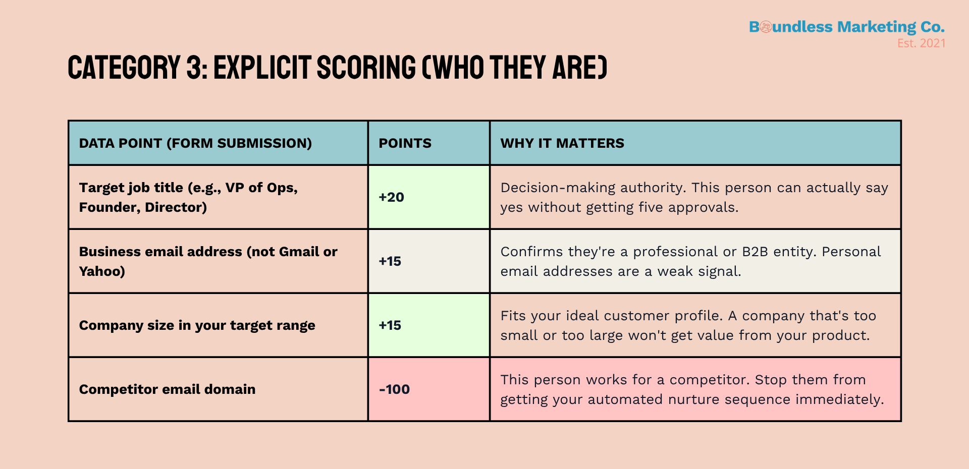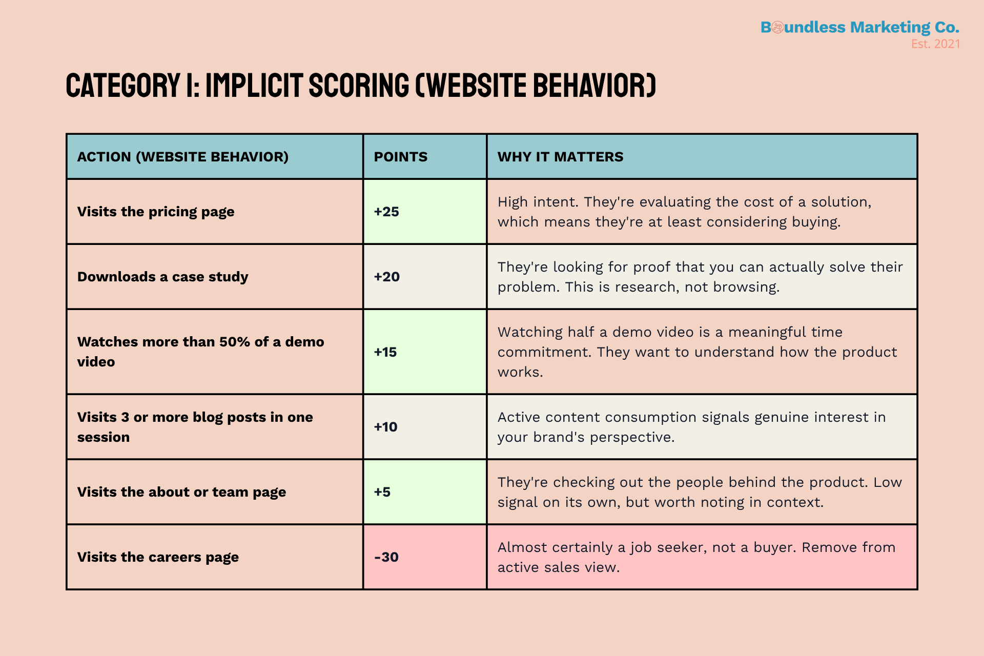 Implicit scoring: What the lead is doing on your website and with your content. These are the strongest signals because they're active behaviors the lead is taking without being asked.