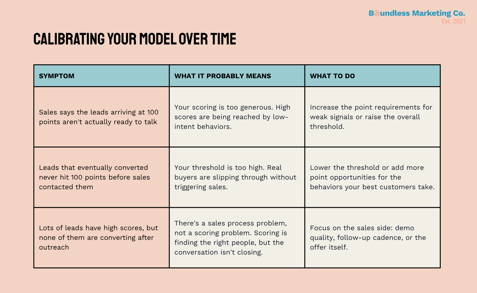 The most useful calibration habit is a monthly sales-marketing alignment check. Sit down together and ask: of the leads that hit 100 points this month, how many were actually ready to talk? If sales consistently say the leads are too cold, your scoring is too generous. If they're saying they wish they'd been alerted earlier, your threshold is too high. Adjust accordingly and revisit again next month.