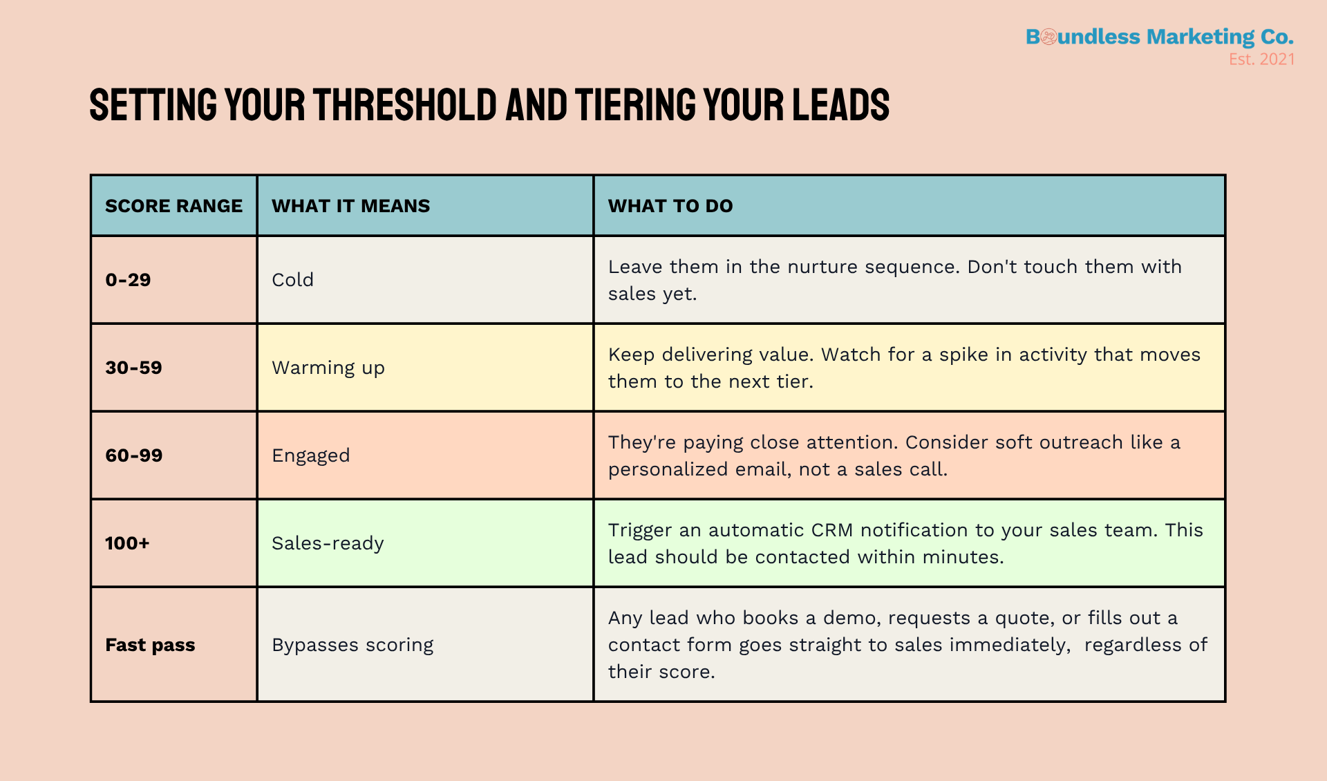 The 100-point threshold is a starting point, not a fixed rule. What the threshold should actually be depends on your sales cycle, your team's capacity, and what your data shows about the behaviors that actually precede a purchase. Here's a tiered framework to work from: